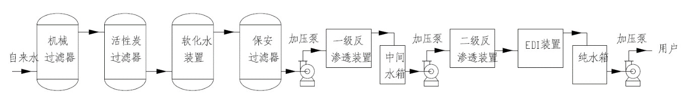 纯水是怎么制备得到呢?目前在工厂,工艺流程大多是下图所示: