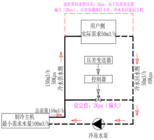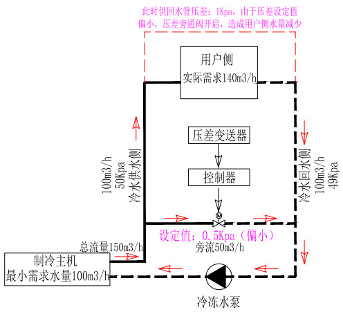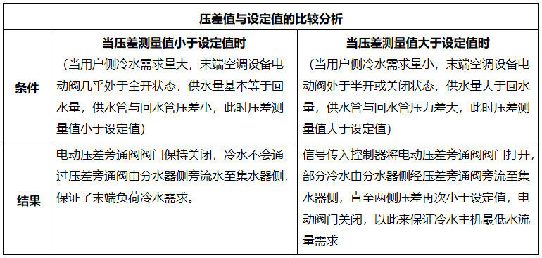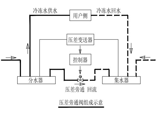 上图为典型的压差旁通阀的组成示意。压差旁通阀由压差变送器、控制器及电动阀门组成。压差变送器测得分水器侧(冷冻水供水侧)与集水器侧(冷冻水回水侧)之间的压差值与设定值的比较分析: