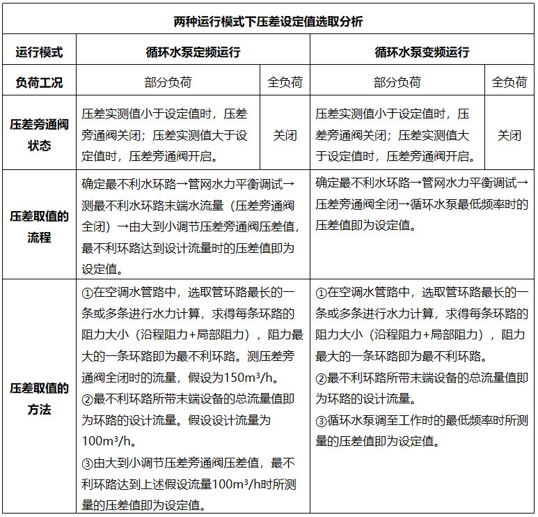 中央空调冷水系统中的循环水泵有定频和变频两种运行模式,两种模式下压差旁通阀压差设定值取值方式有所不同,取值分析如下: