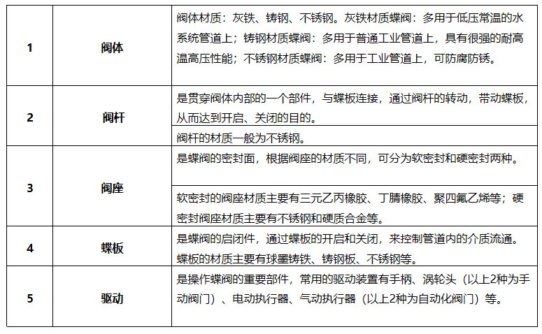 组成蝶阀的主要部件有:阀体、阀杆、阀座、蝶板和驱动,具体如下: