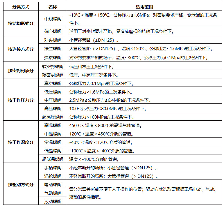 蝶阀可以按照多种方法进行分类,不同类型的蝶阀的适用范围不同,具体如下: