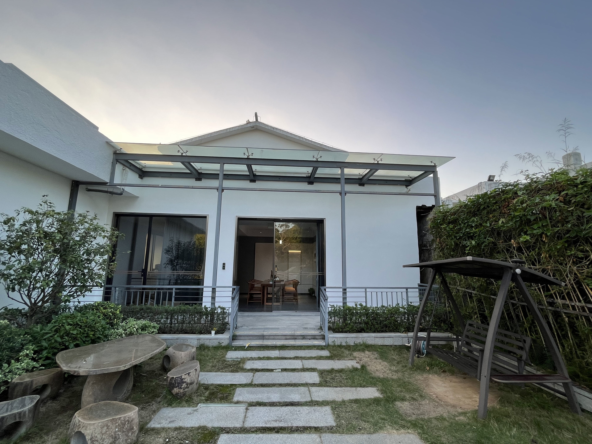 在东部露台处,由向外凸出的玻璃围合而成的“亭”,是室内外融合的极致体现。蓝天、白云、青山、绿水融入室内,从书中抬头就是另一番风景。阳光随着光线的移动呈现出明与暗的相互交织,让人能感受时间的轨迹。正是明净至简,窗外有水有树,斋中有几有椅,一卷书籍,一壶清茶的理想实现。