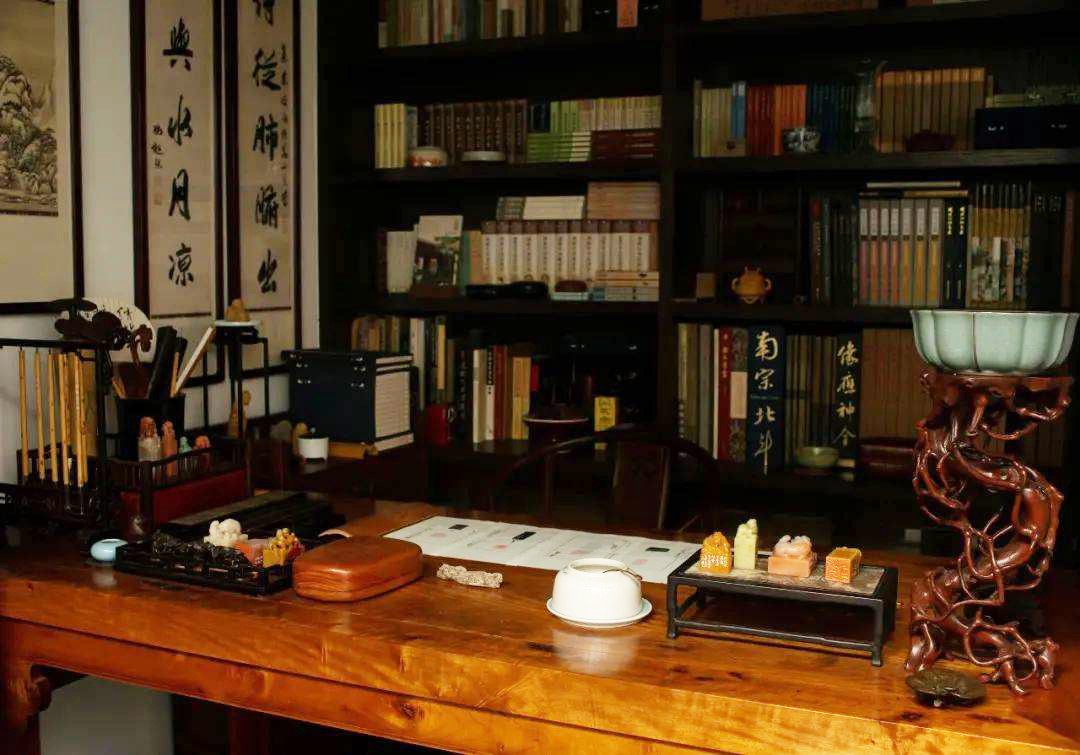 以实木书架三面围合而成的半封闭书房是中国古代书斋的缩影,内置红木长桌一张,椅子四把,以丹青笔墨辅之,旁置文竹、松柏盆景。空间相对独立,利于文人墨客默读书卷,静思独处。