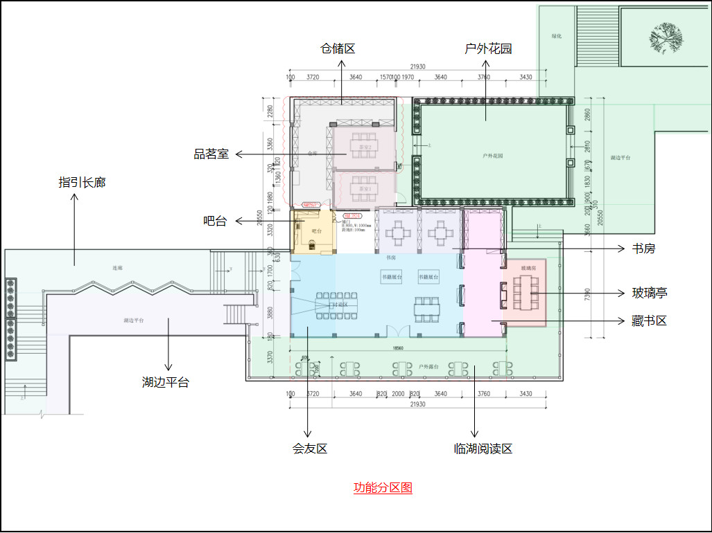书吧空间划分出会友区、藏书区、书房、品茗室、户外花园及以山水构建出古时书斋中的各种使用场景,创造出一种私家书斋体验感。