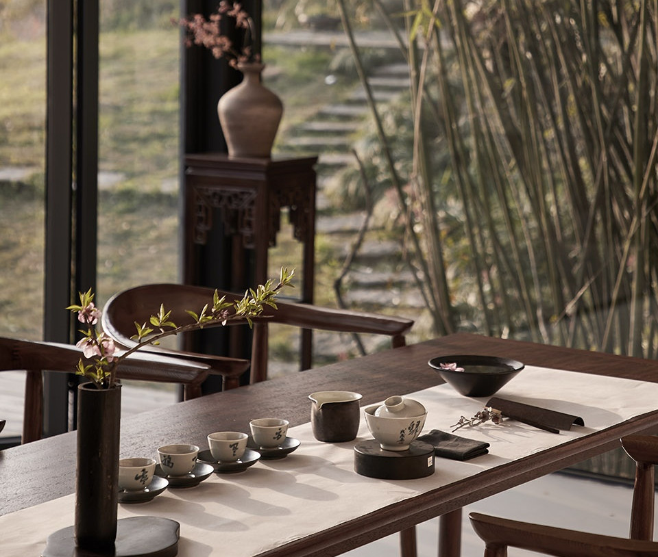 沿着临湖阅读区前行,视野豁然开朗,潜藏在绿植中的一隅茶室跃然眼前。茶室内部没有过多的装饰,素色墙面,一画、一灯、一茶、一友,或品茗沉思,或商略古今,尽显风雅。