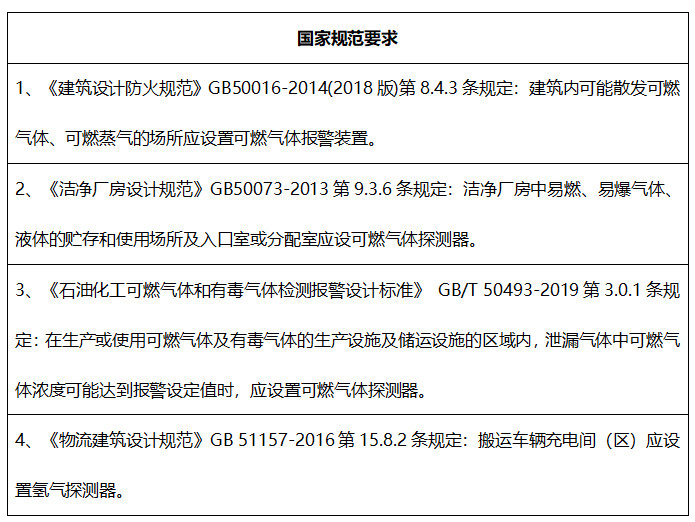 大多数可燃气体探测器都是广谱型,其检测范围一般包括氢气(H2)、甲烷(CH4)、乙炔(C2H2)、乙烯(C2H4)、乙烷(C2H6)等。根据《石油化工可燃气体和有毒气体检测报警设计标准》 GB/T 50493-2019第3.0.5、3.0.6、5.2.3-2、5.5.1-1条规定,铅酸蓄电池电动叉车充电区内可燃气体探测器的选型应满足下列要求: